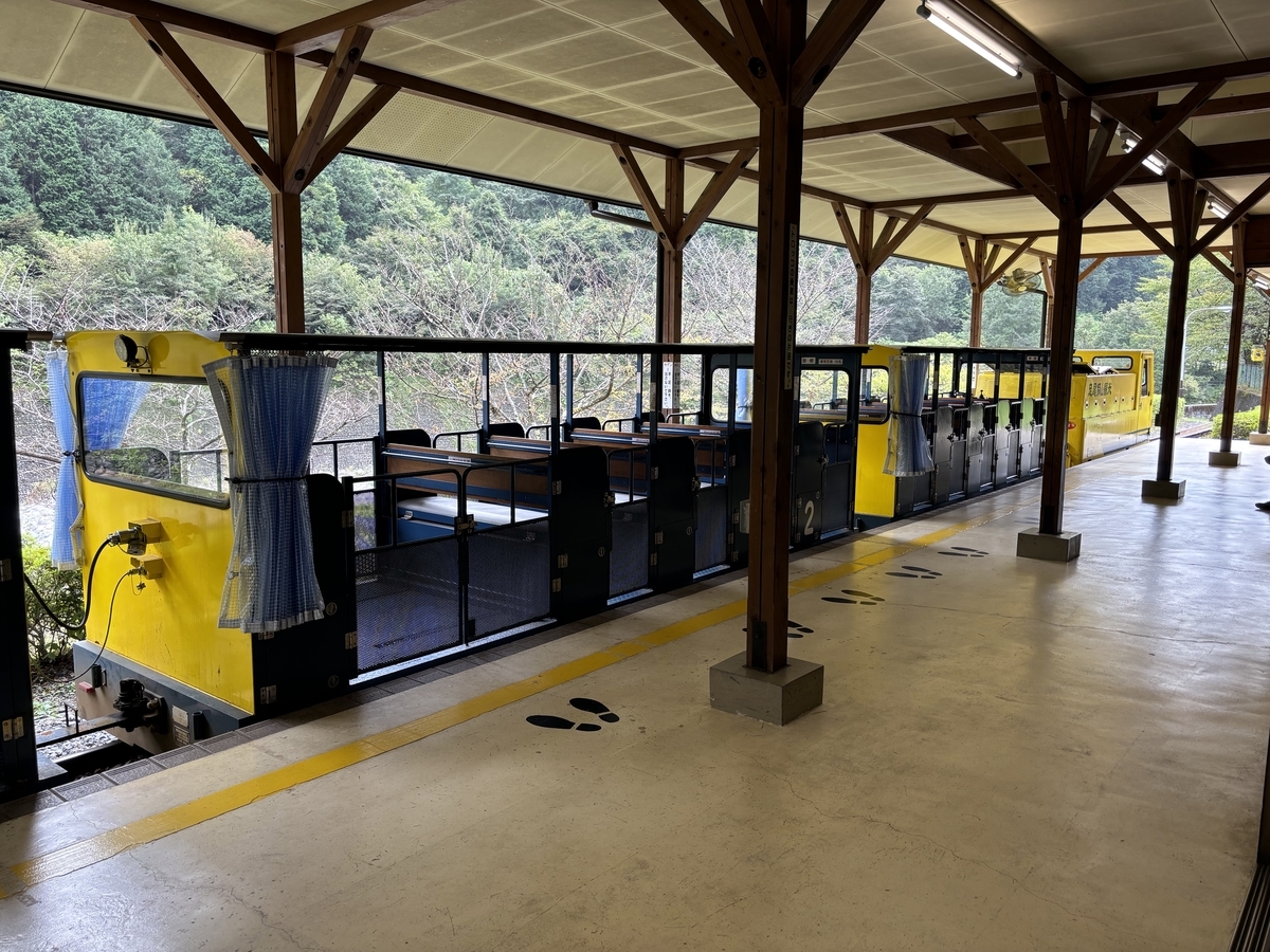 途中で先頭車両を切り離し、坑内へと入っていき降車場でトロッコとお別れです。
