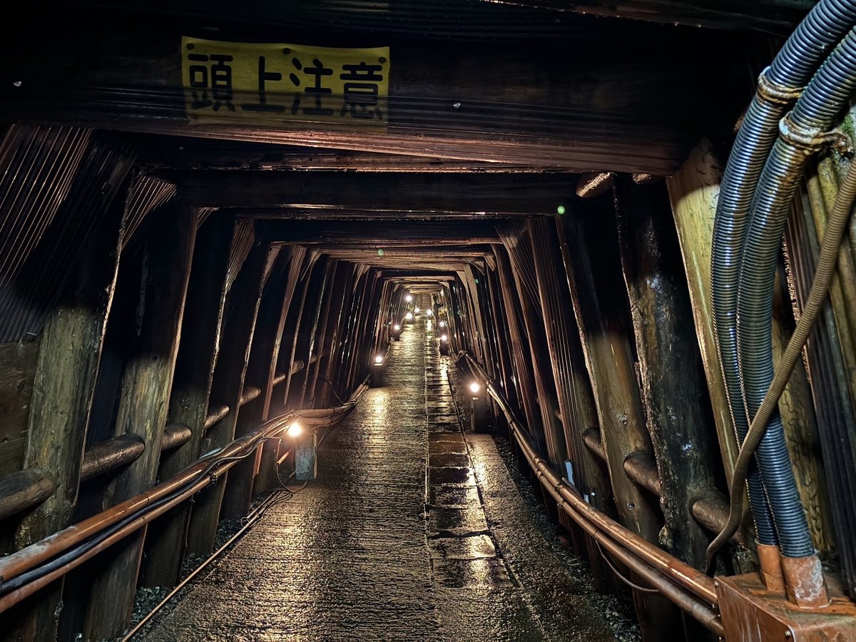 坑道内部は、湧水で路面が濡れており、半袖では少し冷んやりしました。